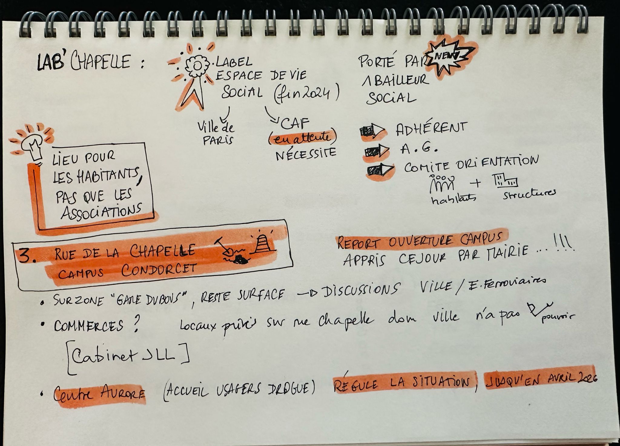 Le Lab’ Chapelle, animé par Damien, est un lieu innovant porté par un bailleur social — une première à Paris. Ouvert aux associations locales, il a obtenu le label Espace de Vie Sociale en 2024 et pourrait être labellisé CAF à l’été 2025. L’espace est mis gratuitement à disposition, cofinancé par ICF et Paris Habitat. Un mode de gouvernance est en cours de définition, avec la création possible d’un comité d’orientation participatif.